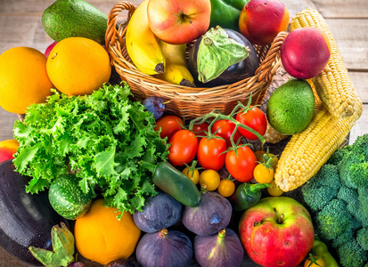 KI generiert: Eine grüne Kiste voller frischem Gemüse und Obst, auf Holzstufen platziert.
