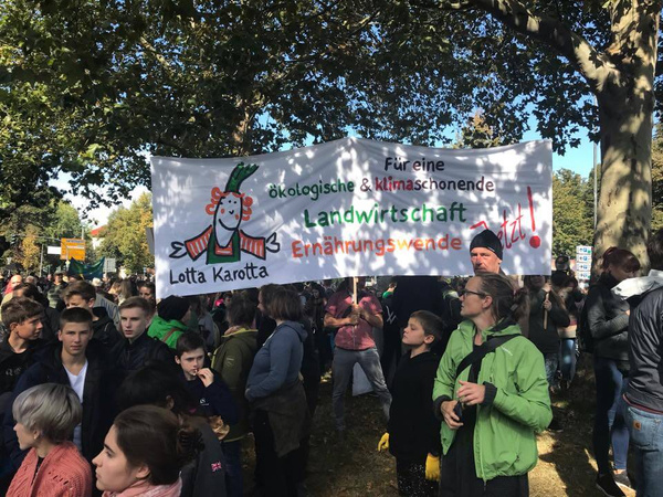 Mit einem Teil des LOTTA KAROTTA-Teams und unserer Gärtnerei "Rote Rübe - Schwarzer Rettich" haben auch wir uns auf den Weg gemacht um uns stark zu machen für eine ökologische Landwirtschaft und einen Wandel der Ernährungsgewohnheiten. Etwa 10 000 Menschen allen Alters und vor allem zahlreiche Kinder haben Íhren Forderungen lautstarkt Ausdruck verliehen. Die Klima-Forderungen der Kindergarten-Kinder über den Lautsprecherwagen hatten dabei schon eine besonders beeindruckende Gänsehaut-Wirkung.