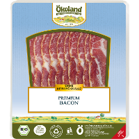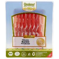 Über 2 Monate im handwerklichen Naturreifeverfahren ohne Nitritpökelsalz gereift und anschließend schonend geräuchert, entwickelt der Ökoland Premium Bacon seinen unverfälschten Geschmack. Nur magerer Schweinebauch wird hierfür verarbeitet, alles unter strengen Qualitätskontrollen. Bioland-zertifiziert. Den Bacon vor dem Verzehr vollständig durcherhitzen. Von Natur aus glutenfrei, laktosefrei, natürliche Hefenbildung durch Fermentation. Innovative Verpackung aus Polypropylen (PP) bewirkt hohe Recyclebarkeit für die Kreislaufwirtschaft von Verpackungsmaterialien.