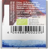 Roh-Rohrzucker*, Kakaobutter*, VollMILCHpulver*, Kakaomasse*, SAHNEpulver*, MagerMILCHpulver*, Bourbon Vanilleextrakt*. Kakao: 33% mindestens. Milchbestandteile: 26%.Kann Bestandteile von SCHALENFRÜCHTEN und GLUTEN enthalten.