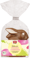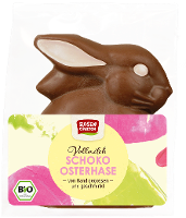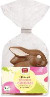 Sitzender Osterhase aus bester Bio-Vollmilchschokolade, mit weißer Schokolade verziert
