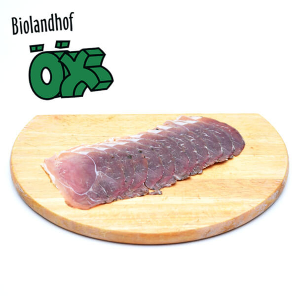 Bio-Wacholderschinken ist eine besondere regionale Spezialität. BIolandhof Öx befindet sich am Rande der Hie- und Kripplöcher, ein Naturschutzgebiet mit einer wunderschönen Wacholderlandschaft. Was liegt da näher als ein Schinken mit genau diesem Aroma? Das Fleisch für den Schinken stammt von Bioland-Schweinen und wird mit Wacholder, Honig, Salz und etwas Knoblauch gewürzt. Anschließend reift er über einen Zeitraum von etwa 8 Wochen und wird in dieser Zeit mit Buchenrauch geräuchert. Dadurch bekommt er sein leckeres Aroma und eine leichte rauchige Note. Damit er sein ganzes Aroma entfalten kann, am besten eine halbe Stunde vor dem Verzehr aus dem Kühlschrank und der Verpackung nehmen.