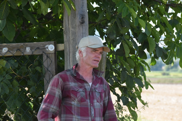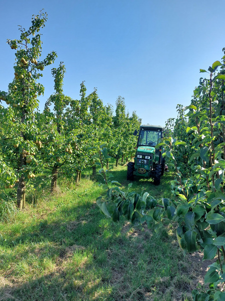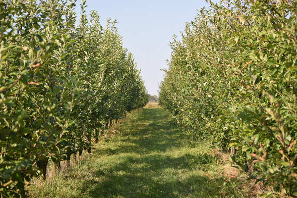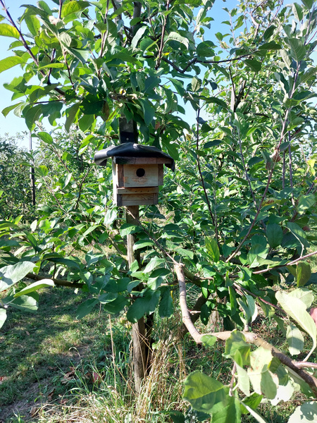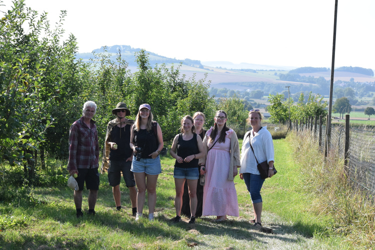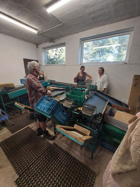 Der Bioland-Betrieb bei Moringen besteht seit 2010 und ist aus dem Bio Obstbau Gebhardt entstanden. Nach langjähriger Zusammenarbeit mit Manfred Gebhardt hat Rainer Krumwiede den Bio Obstbau Leinetal mittlerweile vollständig übernommen. Die zugehörige 4,5 ha große Plantage liegt in Sudheim in der Nähe von Nordheim. Um nicht nur verschiedene Geschmacksrichtungen, sondern auch versetzte Entezeitpunkte zu erzielen, wachsen dort aktuell 9 verschiedene Apfel- und 3 Birnensorten und damit um die 2.000 Obstbäume. Rainer Krumwiede erklärte uns, dass die Bäume ca. 15 Jahre alt werden und der Bestand regelmäßig durch neue Bäume verjüngt wird. Dabei gilt es, auf die richtige Mischung der Sorten zwischen den Reihen zu achten, um eine möglichst gute Befruchtungsbasis für die Blüten zu erzeugen. Außerdem setzt Krumwiede auf die Zusammenarbeit mit einem Bioland-Imker während der Blütezeit und bietet Obstblüten-liebenden Mauerbienen zahlreiche Nistmöglichkeiten auf dem Gelände. Darüber hinaus dienen ungemähte Blüh- und Grasflächen zwischen den Reihen Insekten als Nahrung und Lebensraum. Auch insgesamt bildet die Plantage landschaftlich eine Abwechslung zum sonst ackerbaulich eher intensiv genutzten Leinetal, was vor allem verschiedene Vogelarten freut, auf die verschiedene Nistkästen auf der Fläche warten.