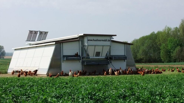 Auch die Masthähnchen werden in solchen mobilen Ställen gehalten, um ihnen den größtmöglichen geschützten Auslauf in artgerechter Haltung zu gewährleisten.
