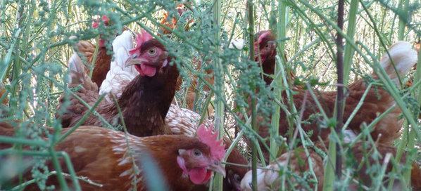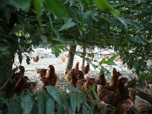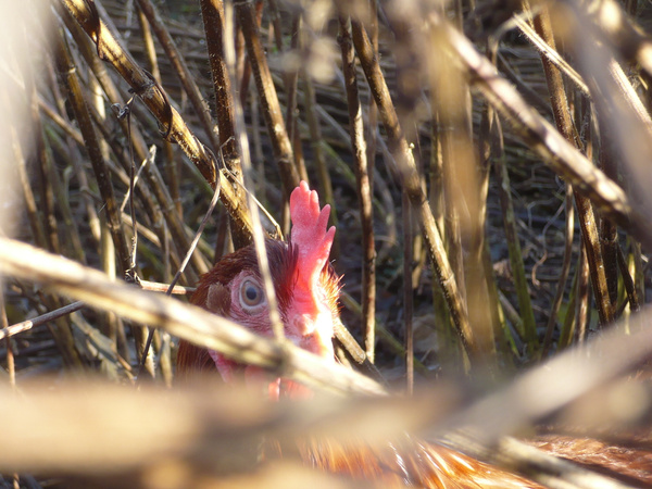 Der Dschungelähnliche Auslauf bietet den Hennen optimalen Schutz vor Greifvögeln und Füchsen. Es ermöglicht es den Hennen sich frei zu bewegen, da sie ausreichend Wildnis vorfinden, welche eine gute Deckung ermöglicht. Die Wildnis wird vor allem geschaffen durch Brennnesseln, Taubnesseln, Himbeeren und Brombeeren. Der Schnitt der Weidenbäume dient als zusätzliches Material. Hätten die Hühner diese Möglichkeit nicht, dann würden sie sich nie weit vom „sicheren“ Stall entfernen. Außerdem haben sie ausreichend Fläche zum Scharren, Entdecken und Einnehmen von wohltuenden Staubbädern.