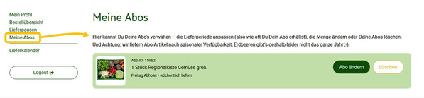Du möchtest die Lieferperioden von regelmäßig kommenden Ökokisten oder Dauerartikeln anpassen, deren Menge ändern oder Deine Abos löschen? Bei den persönlichen Einstellungen unter "Meine Abos" ist das mit wenigen Klicks gemacht!